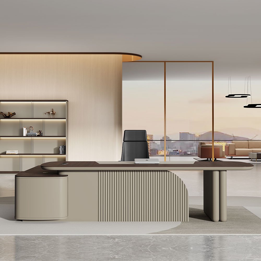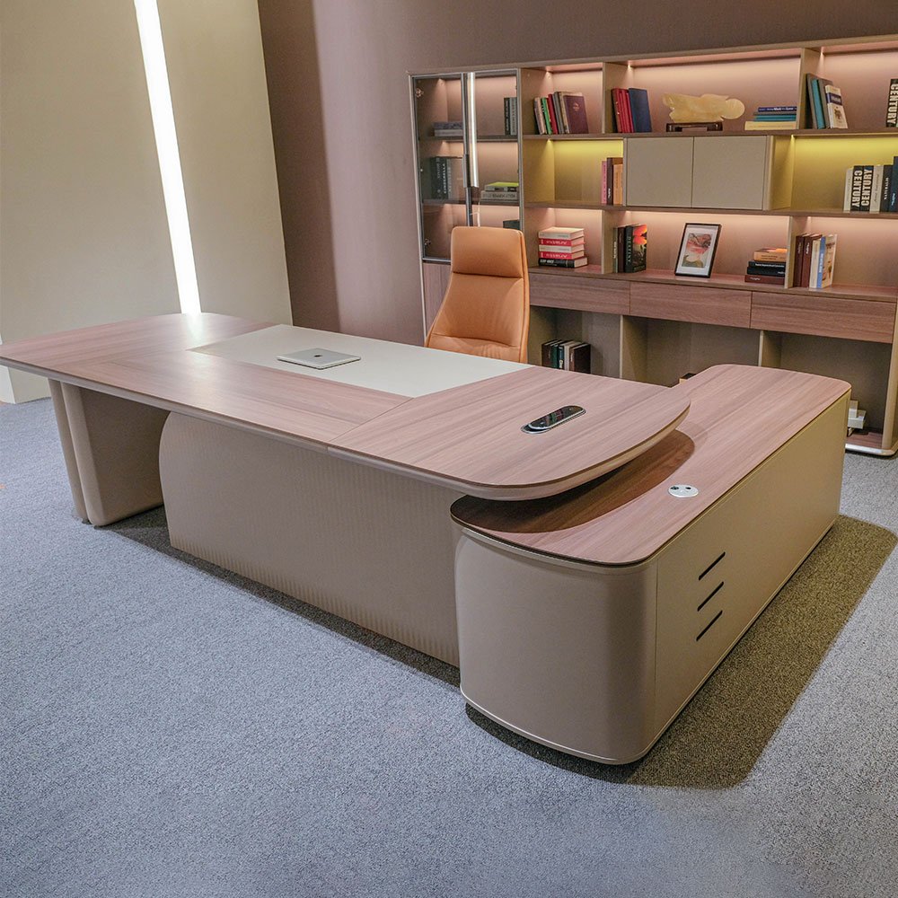 Spacious L-shape design provides ample room for dual monitors, documents, and decor – perfect for focused work or client meetings.